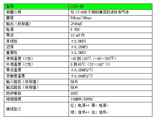 CYS3系列無腔壓力傳感器采用SO硅微熔工藝,前端無腔測量膜片,尤其適用于測量粘度大溫度高的液體。適用于電子行業(yè)點膠機、食品加工等多種測量控制場合。